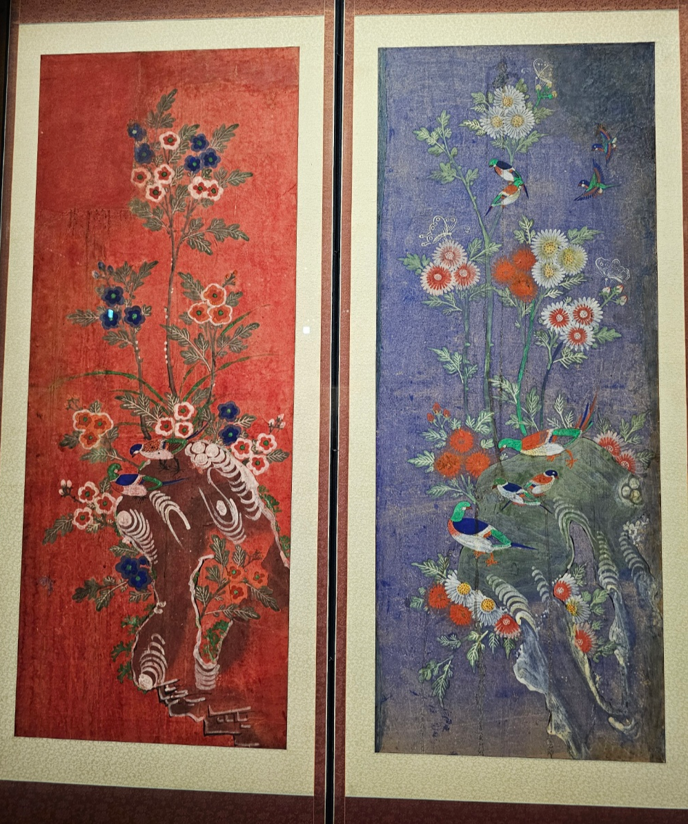 특히 인상 깊었던 작품 중 하나는 '문자도(文字圖)' 병풍이었습니다. '백수백복도(百壽百福圖)'처럼 '수壽'자와 '복福'자를 다양한 서체로 반복해 배열하고, 그 사이에 원앙, 거북, 두꺼비 같은 복을 상징하는 동물들을 함께 그려 넣은 구성이 정말 매력적이었습니다.