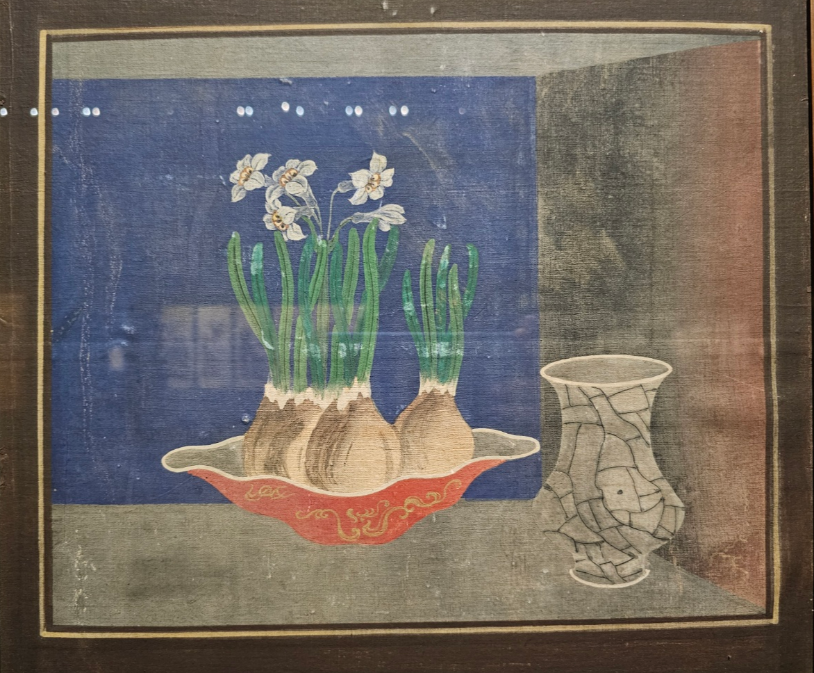 이 책가도는 정갈하게 나뉜 칸마다 책, 꽃병, 문방구, 청동기, 식물 등 조선 후기 선비의 품격과 교양을 담은 오브제들이 가득 들어있어, 마치 박물관 속 보물 찾기를 하는 듯한 재미를 선사합니다. 각 칸을 하나하나 들여다보며 숨겨진 디테일을 찾아보는 것만으로도 충분히 흥미진진한 경험이었습니다. (처음에 이 꽃을 보고 '양파에도 이렇게 예쁜 꽃이 피다니!!" 감탄했는데... 알고보니 수선화..)